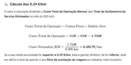 Os 0.29 €/km (ou, mais precisamente, 0.2917 €/km) é o valor mínimo que cada quilómetro de serviço em vazio/cheio, tem de lhe render líquido (após a dedução da comissão de 25% da plataforma) para que, no final do mês, você cubra todos os custos da operação e ainda retire o seu salário alvo.